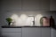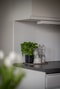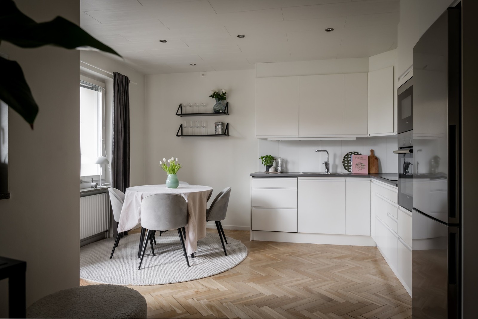 Väl tilltaget kök i vinkel med gott om förvaring och arbetsyta. Modern design med vita släta luckor med integrerade handtag och grå bänkskiva. Mellan överskåp och bänkyta sitter vita kakelplattor. Köket har full maskinell utrustning så som glashäll, fläkt, integrerad diskmaskin, kyl/frys, mikro och ugn i ergonomisk arbetshöjd. I köket ryms gott och väl en matplats för 4-5 sittande gäster utan att det upplevs trångt. Golvet pryds med vacker parkett i fiskbensmönster och väggar är målade i vitt. I taket sitter spotlights som er ett behagligt ljus.