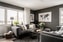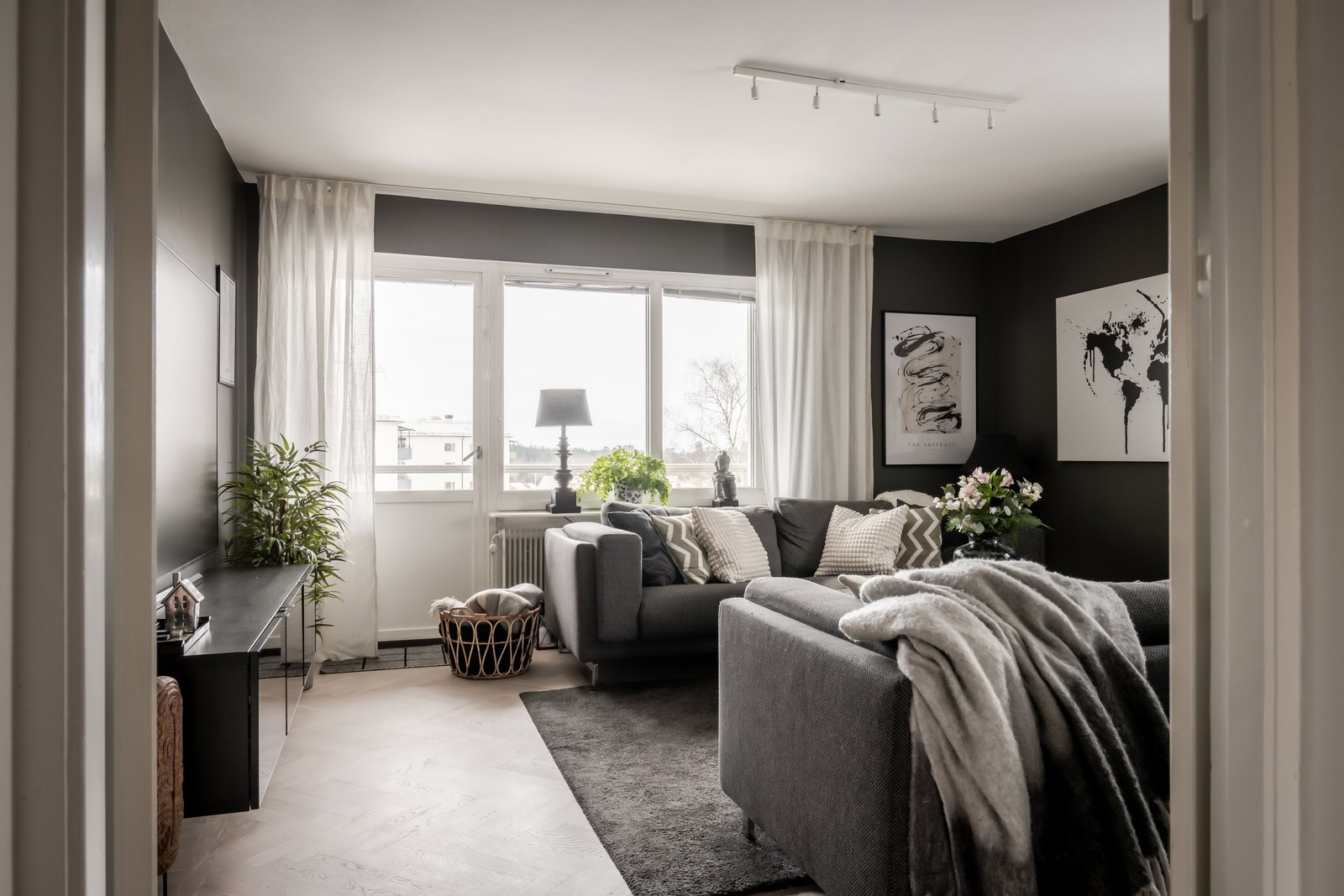 Från hallen öppnas vardagsrummet upp genom vackra glasade dubbeldörrar. Ett rymligt rum där ljuset strömmar in från två håll. Golvet pryds av parkett i fiskbensmönster och väggarna är målade i en behaglig grå ton. Från vardagsrummet nås balkongen som vetter mot söder, en perfekt plats att sitta ostört, njuta av solen och utsikten.