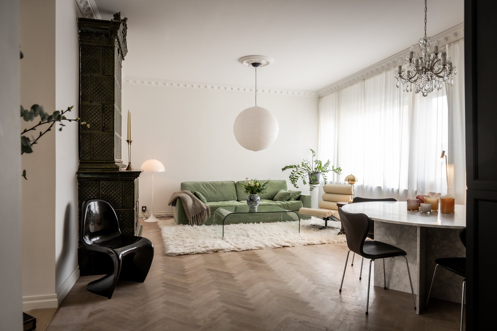 Bjud in gästerna till det spatiösa vardagsrummet med kombinerad matsal. Interiören överraskar totalt med strålande ljusa ytor, tack vare de stora fönsterpartierna ut mot gården bjuds det naturliga ljusflödet in sent in på kvällstimmarna. Den klassiska fiskbensparketten flyter ut under det höga taket där avancerad stuckatur pryder. I taket tronar de obligatoriska takrosetterna. Härinne finns alla tidstypiska originaldetaljer på plats. Detta är ett stort rum för fest och mingel, eller lugna vardagskvällar i tidlöst vacker miljö – en höstkväll slår ni er till ro framför den vackra kakelugnen.