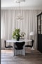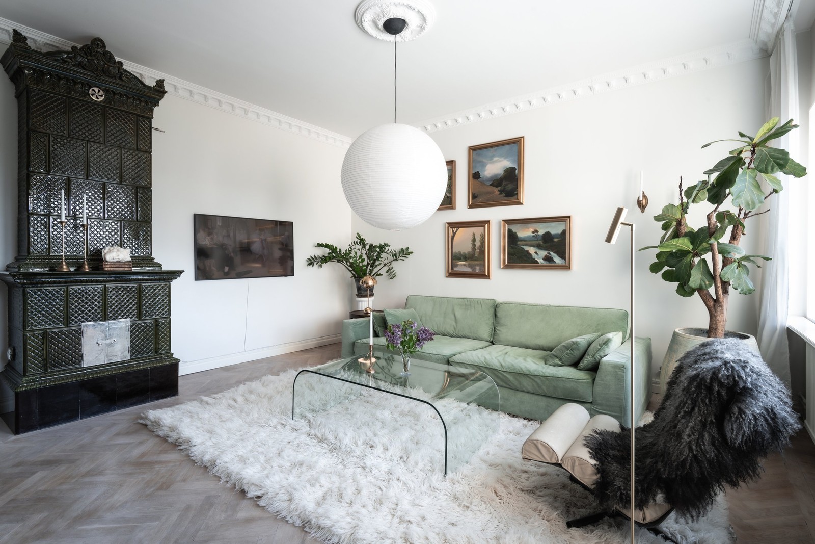 Bjud in gästerna till det spatiösa vardagsrummet med kombinerad matsal. Interiören överraskar totalt med strålande ljusa ytor, tack vare de stora fönsterpartierna ut mot gården bjuds det naturliga ljusflödet in sent in på kvällstimmarna. Den klassiska fiskbensparketten flyter ut under det höga taket där avancerad stuckatur pryder. I taket tronar de obligatoriska takrosetterna. Härinne finns alla tidstypiska originaldetaljer på plats. Detta är ett stort rum för fest och mingel, eller lugna vardagskvällar i tidlöst vacker miljö – en höstkväll slår ni er till ro framför den vackra kakelugnen.