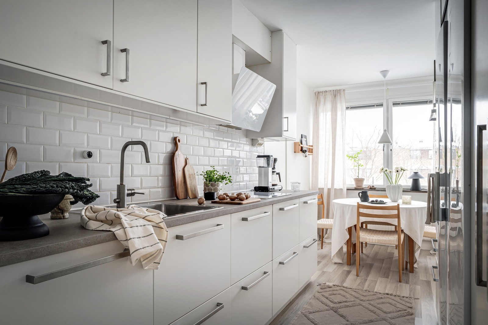 Vidare in i bostaden finner du köket som är renoverat i en modern och tidlös design så sent som 2021/2022. Klassiskt vita luckor med beslag av borstat stål bryts snyggt av mot en grå bänkskiva (från 2026) och ovansittade vitt kakel. Här finns gott om arbetsyta samt förvaringsmöjligheter för kökets alla redskap. En fröjd för hemmakocken att skapa mat- och bakkonst på! Den maskinella utrustningen består utav induktionshäll, fläkt, ugn och mikro i arbetshöjd, integrerad diskmaskin, samt separat kyl och frys i fullhöjd. Intill de två stora fönsterpartierna ges en naturlig plats att inreda för matbord som kan dukas upp till ca 4-6 personer. Ett gemytligt kök som bjuder in till matlagning och social samvaro med vänner och familj.
