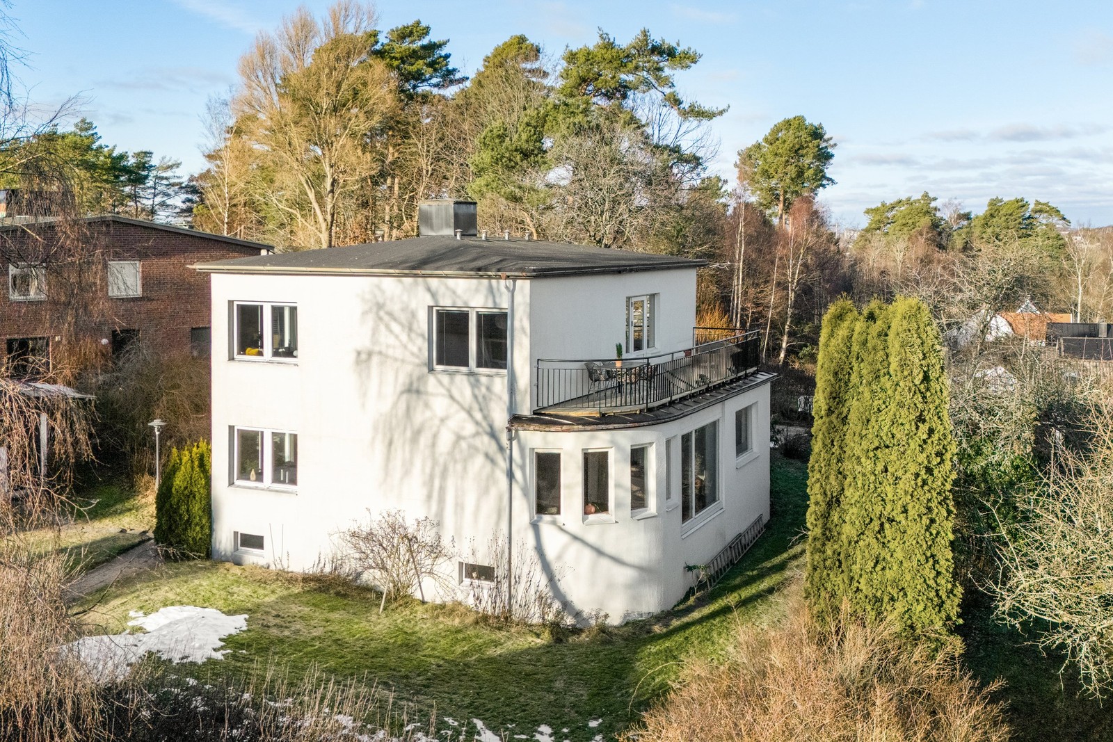 Huset är uppfört i två plan om totalt ca 240 kvm inklusive källare och kompletteras av ett fristående garage. Stora fönsterpartier i alla väderstreck skapar ett fantastiskt ljusflöde, i samspel med generös takhöjd som förstärker känslan av rymd och kvalitet.