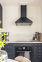 Vidare når man det moderna köket med mörka köksluckor och laminat i marmorlook som snyggt bryter av och matchar bänkskivan. Gott om arbetsyta och förvaring. Den maskinella utrustningen består av induktionshäll, ugn, fläkt, mikro, diskmaskin samt kyl och frys i fullhöjd. Invid fönstret erbjuds plats för matbord.