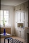 Varmt välkommen till Bagaregården och Storkgatan. Ta trapporna till våning två och kliv in genom ytterdörren där du direkt välkomnas av en stor, öppen hall med gott om avhängningsmöjligheter. Två vackra, inbyggda klädkammare i originalutförande erbjuder generöst med förvaring. Här finns dessutom ytterligare plats för garderob om så önskas. Lägg direkt märke till de vackra brädgolvet som är framtagna här liksom i resten av bostaden.