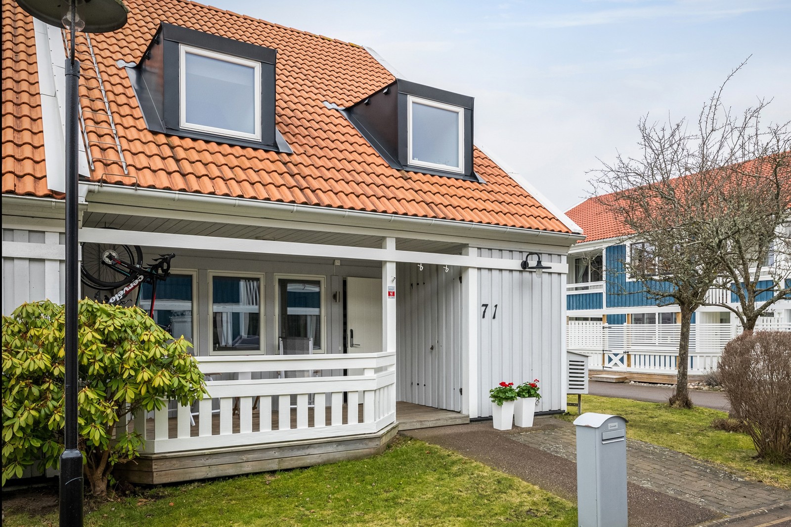 Framsidan erbjuder en möblerbar entré under tak med behaglig morgonsol – en uppskattad plats för dagens första kaffekopp. Läget i områdets ytterkant ger dessutom direkt närhet till natur och fina promenadstråk.