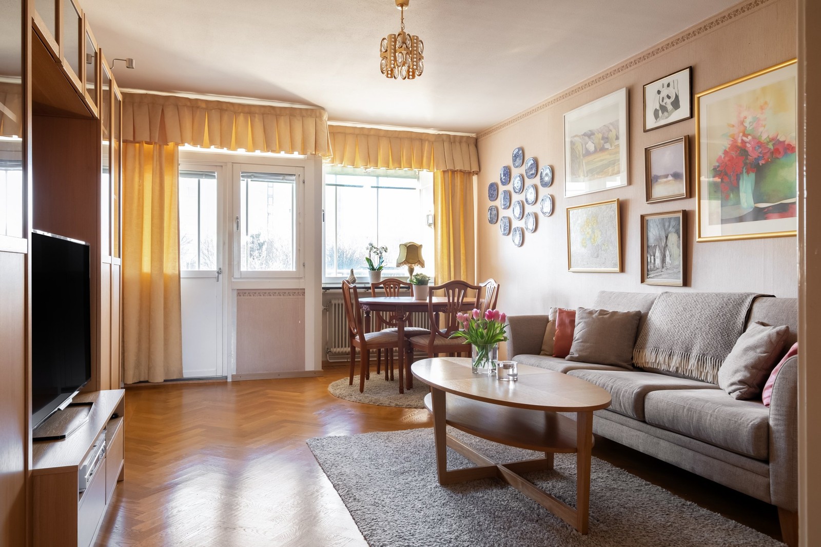 Vidare in i bostaden nås ett rymligt vardagsrum med plats för både soffa och matbord. Härligt ljusinsläpp från det stora fönsterpartiet samt utgången till den inglasade och rymliga balkongen i västerläge.