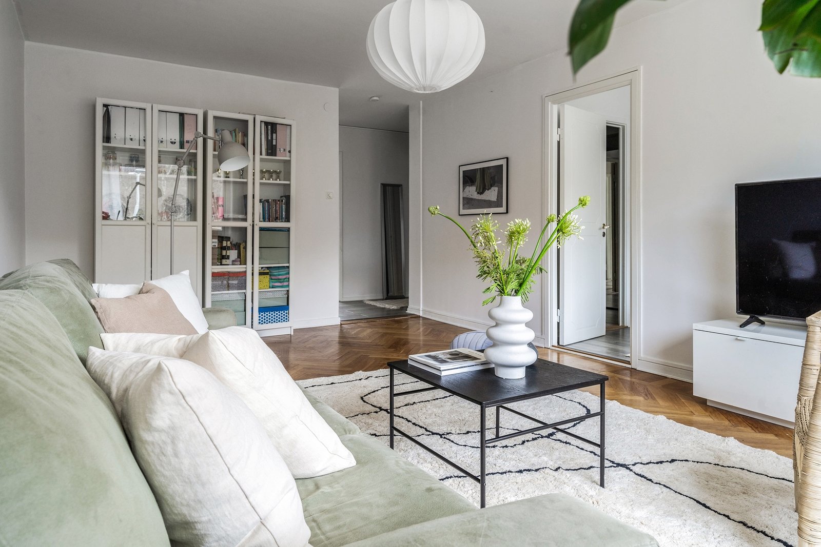 Till vänster om köket ligger bostadens hjärta. Ett lättmöblerat och ljust vardagsrum med utgång till den härliga balkongen i soligt västerläge där du kan avnjuta kvällssolen. Vita väggar och ett stort fönster ger ett härligt ljusflöde i rummet. På golvet ligger fiskbensparkett.
