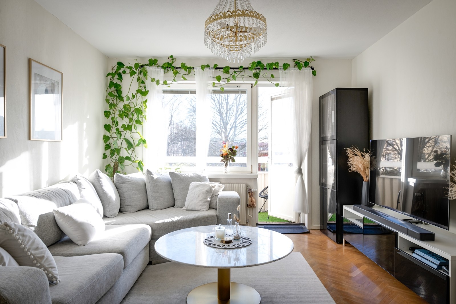 Till vänster i hallen nås lägenhetens vardagsrum. Här får du med enkelhet plats för en stor soffgrupp med tillhörande möblemang och även ett matbord om så önskas. Härifrån når du balkongen som ligger i ett soligt söderläge och med en vägg av grönska samt innergård som närmsta granne. Här kan du sitta och njuta många timmar om dagen.