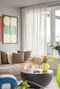 Vardagsrummet går sömlöst ihop med köket och ger en naturlig plats för soffa, soffbord och tv-bänk. De stora fönsterpartierna släpper in rikligt med naturligt ljus, vilket skapar en luftig och rogivande atmosfär. Väggarna i ljusgrått binder samman kök och vardagsrum och förstärker den rymliga känslan. Golvet pryds av en vacker parkett.