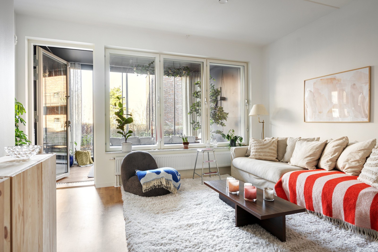 Vidare till det trivsamma vardagsrummet som blir den självklara samlingspunkten för vänner och familj. Ett massivt ljusinsläpp bildas tack vare stora fönsterpartier. Här ryms matplats, soffgrupp samt läshörna. Från vardagsrummet öppnar sig köket mot den inglasade uteplatsen och under sommartid blir den stora uteplatsen en förlängning av lägenheten - allt i en social planlösning.