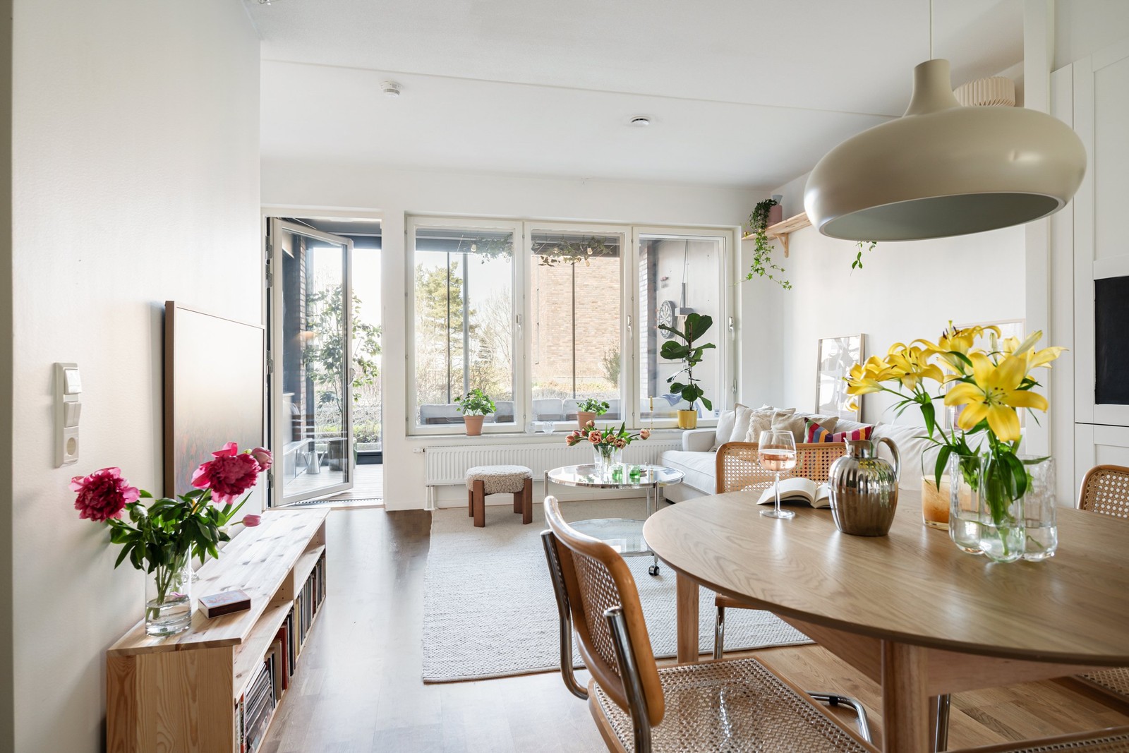 Vidare till det trivsamma vardagsrummet som blir den självklara samlingspunkten för vänner och familj. Ett massivt ljusinsläpp bildas tack vare stora fönsterpartier. Här ryms matplats, soffgrupp samt läshörna. Från vardagsrummet öppnar sig köket mot den inglasade uteplatsen och under sommartid blir den stora uteplatsen en förlängning av lägenheten - allt i en social planlösning.