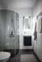 Bostadens andra badrum finns på övre plan och är likt det andra badrummet stilrent inrett med mörkgrå klinker och vitt kakel. Inredningen består av wc, handfat med kommod, spegel med belysning, handdukstork och duschhörna med infällbara glasväggar.