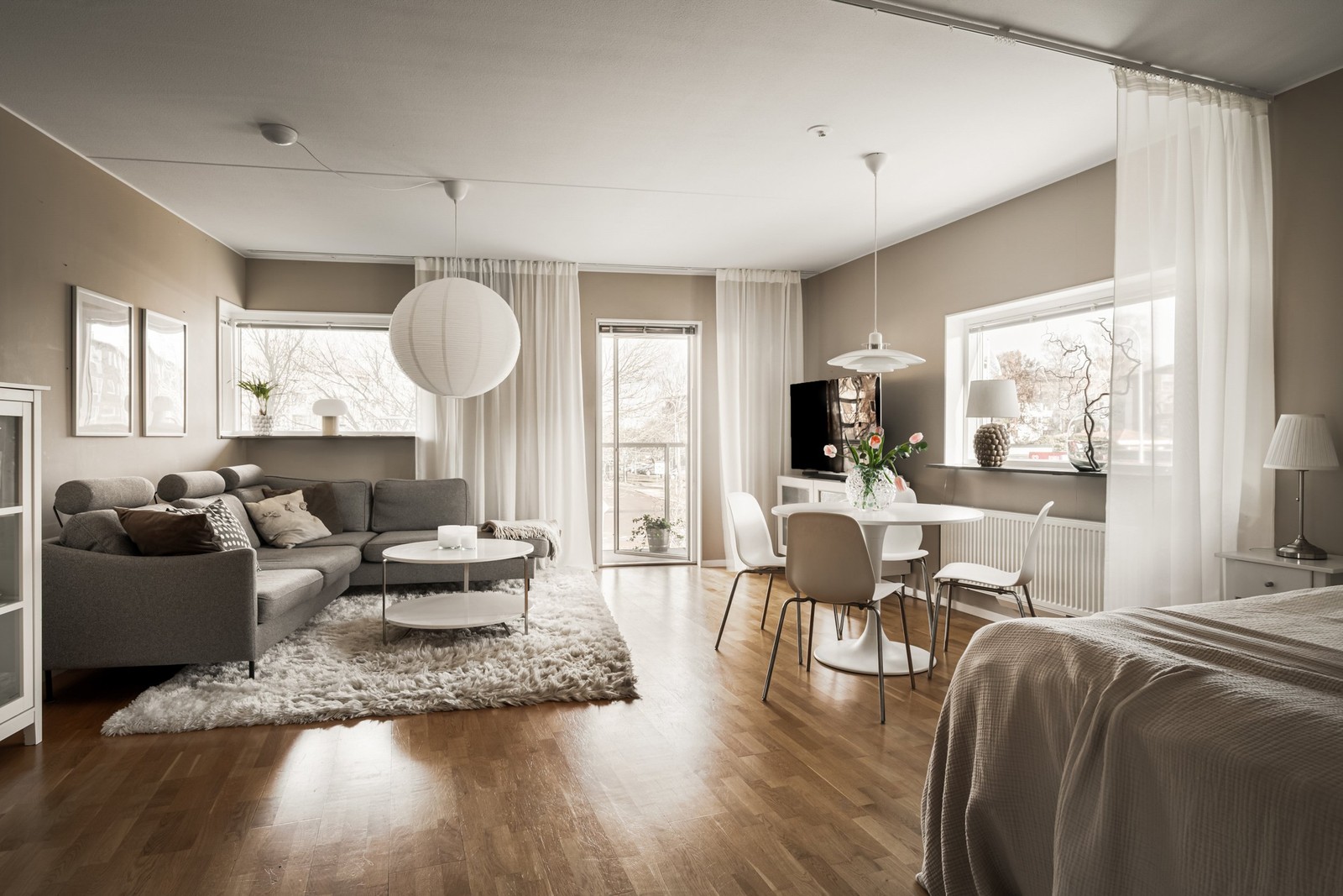 Allrummet är rymligt och flexibelt, med plats för både soffgrupp, matbord och sovhörna. Stora fönster ger ett fint ljusinsläpp från två väderstreck, och från rummet nås balkongen som fungerar som ett förlängt vardagsrum under varma dagar. Sovhörnan kan du omringa med textilier på en skena i taket för att göra det extra mysigt.