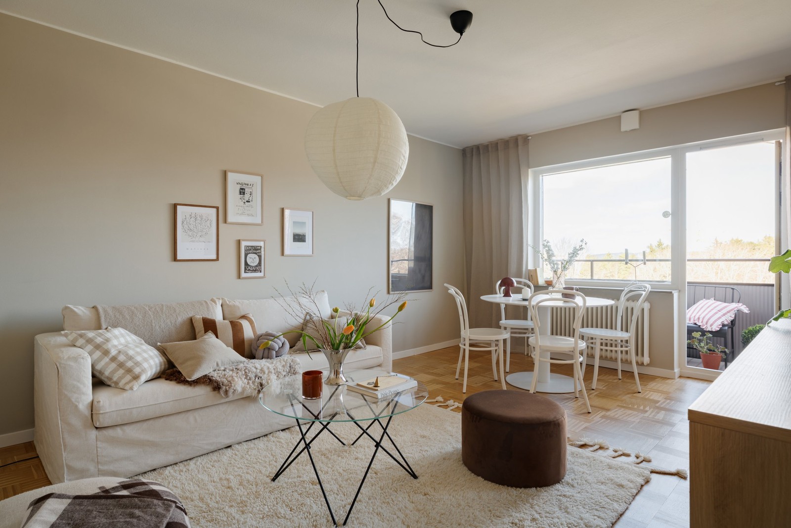 Bostaden präglas av en enhetlig beige kulör på väggarna som tillsammans med nyligen slipad och lackad originalparkett ger ett varmt helhetsintryck. Det stilrena Epoq-köket från 2025 med luckor i beige nyans, svarta nätta beslag och ljus bänkskiva kombineras med kvalitativa vitvaror från Husqvarna. Badrummet är helkaklat i samband med stambytet 2023 och förberett för tvättmaskin.