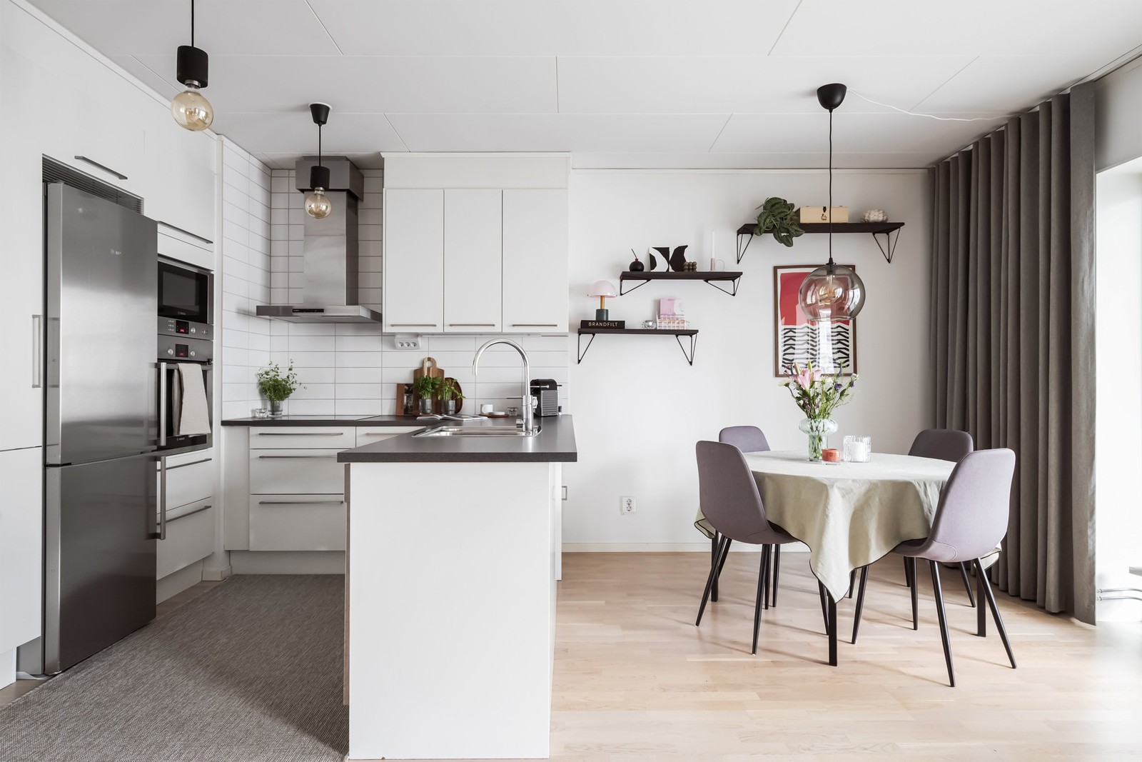 Köket är i stilrent utförande med modern köksinredning, där vita släta luckor, mörk laminatbänkskiva och vitt kakel sätter sin prägel. Maskinell utrustning bestående av diskmaskin, fläkt, inbyggd varmluftsugn, spishäll, inbyggd micro samt kombinerad kyl och frys. Vid köksdelen finns ett skafferi samt ett städskåp. Här ryms större matgrupp för både familj och vänner.