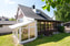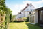 Plan och lättskött trädgård med odlingsmöjligheter med ett växthus.