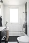 Bostadens badrum är helkaklat med klinker i mörk ton med golvvärme, stora vita kakelplattor på väggarna och genom ett frostat fönster flödar det in dagsljus. Utrustningen består av wc, dusch med duschdörr och takdusch samt ett handfat med rymlig kommod.