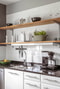 Köket är i stilrent utförande med luckor i vitt som bryts av mot en mörk laminatbänkskiva och vitt kakel ovan arbetsytorna. Köket är praktiskt utformat i vinkel med mycket förvaring och stora arbetsytor. Maskinell utrustning består av ugn med häll, fläkt, diskmaskin samt kombinerad kyl och frys. Här finns även gott om utrymme för en matplats invid fönstret.