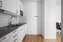 Det moderna och tidlösa köket erbjuder vita släta luckor med rostfria detaljer som bryts av en grå laminatbänkskiva och kompletteras av vitt kakel ovanför arbetsytorna. Maskinell utrustning består av diskmaskin, ugn, spishäll, fläkt samt kombinerad kyl och frys.