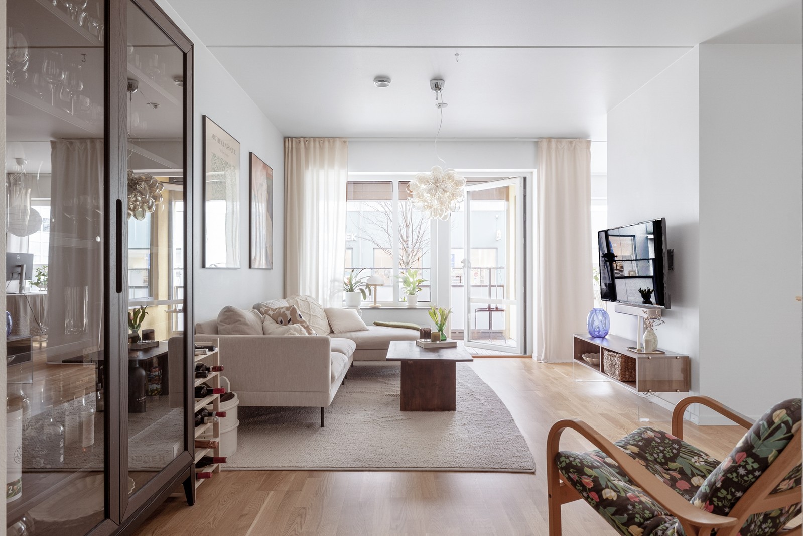 Vardagsrummet är lätt att möblera och erbjuder ett gott ljusinsläpp från rummets generösa fönstersättning. Vardagsrummet ligger med en öppen planlösning mot köket vilket skapar en härlig rymd. Från vardagsrummet når vi den inglasade balkongen.