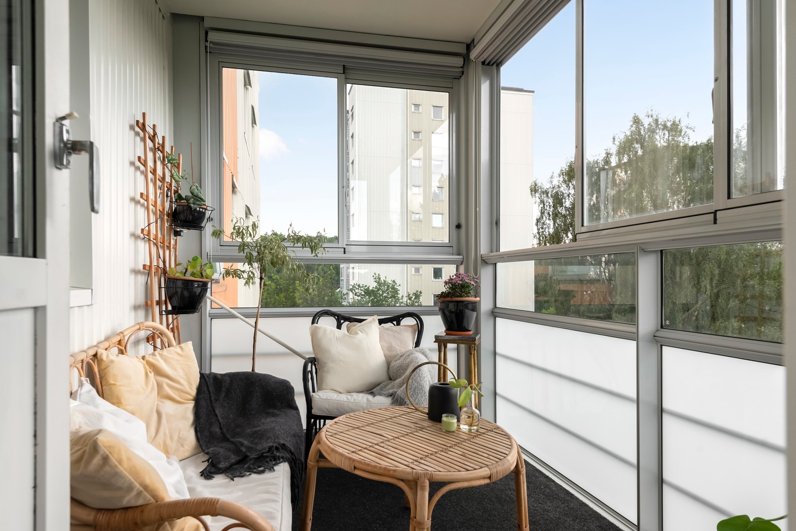 Vardagsrummet är luftigt och rymligt med plats för både soffgrupp och kontorshörna om så önskas. Från vardagsrummet nås den inglasade och möblerbara balkongen i österläge, perfekt för morgonkaffet med utsikt över omgivningen.