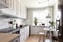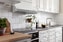 Köket är praktiskt utformat med mycket skåp och ett stilrent utförande med vita spegel fronter som kompletteras av en grå laminatbänkskiva samt matchande vitt kakel. Maskinell utrustning bestående av häll, fläkt, ugn, diskmaskin samt kombinerad kyl och frys. Här ryms matgrupp intill fönstret.