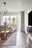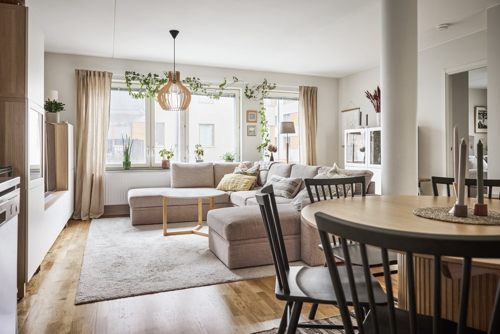 Vardagsrummet har öppen planlösning mot köket, vilket bidrar till den luftiga känslan. Stort fönsterparti skänker rummet rikligt med ljus från fönster i två väderstreck.