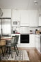 Vidare in i bostaden ligger köket som är ett Myresjökök med vita luckor, laminatbänkskiva med ett vitt kakel ovanför arbetsbänken. Här finns all funktionell utrustning du kan tänkas behöva i form av en full kyl och frys, diskmaskin, induktionshäll från 2021 och ugn. Spis och ugn från Electrolux - Kyl, frys och diskmaskin är från Siemens. Matplatsen vid fönstret har plats för rejält matbord.
