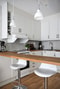Köket är inrett med vita skåpsluckor och ovan arbetsbänken sitter stilrent grått kakel. Utrustningen består av varmluftsugn, spishäll, fläkt, diskmaskin samt kombinerad kyl och frys. Matplatsen har sin givna plats intill ett smart barbord som bjuder in till social gemenskap.