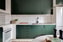Köket hittar ni till höger om hallen och är toppenfint med bra standard och stilsäkra materialval. Gröna skåpluckor med svarta handtag, vitt kakel över en matchande ljus bänkskiva. Här erbjuds gott om förvaring och arbetsyta samt all maskinell utrustning ni kan tänkas behöva så som kombinerad kyl och frys, spis, ugn och fläkt. På golvet ligger nytt golv. Väggarna är målade i vitt.
