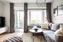 Vidare in i lägenheten kommer du in till den härliga planlösningen mellan vardagsrum och kök. Köket till vänster har all modern utrustning som kan tänkas behövas i form av diskmaskin, kombinerad kyl och frys, induktionshäll, inbyggnadsugn och inbyggd mikrovågsugn. Stilrent och snyggt med vita skåpluckor och mässingsbeslag. Vardagsrummet rymmer både soffgrupp med tilllhörande möblemang samt matbord. Här finns även en sovalkov som rymmer en större säng.