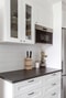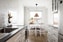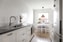 Köket är modernt och praktiskt utformat på motsatta sidor med ett stilrent utförande med vita spegel fronter som kompletteras av en mörkgrå laminatbänkskiva samt matchande vitt kakel. Maskinell utrustning bestående av häll, diskmaskin, ugn och micro i arbetshöjd samt kombinerad kyl och frys. Här ryms matgrupp intill fönstret.