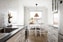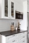 Köket är praktiskt utformat på motsatta sidor med ett stilrent utförande med vita spegel fronter som kompletteras av en mörkgrå laminatbänkskiva samt matchande vitt kakel. Maskinell utrustning bestående av häll, fläkt, diskmaskin, ugn och micro i arbetshöjd samt kombinerad kyl och frys. Här ryms matgrupp intill fönstret.