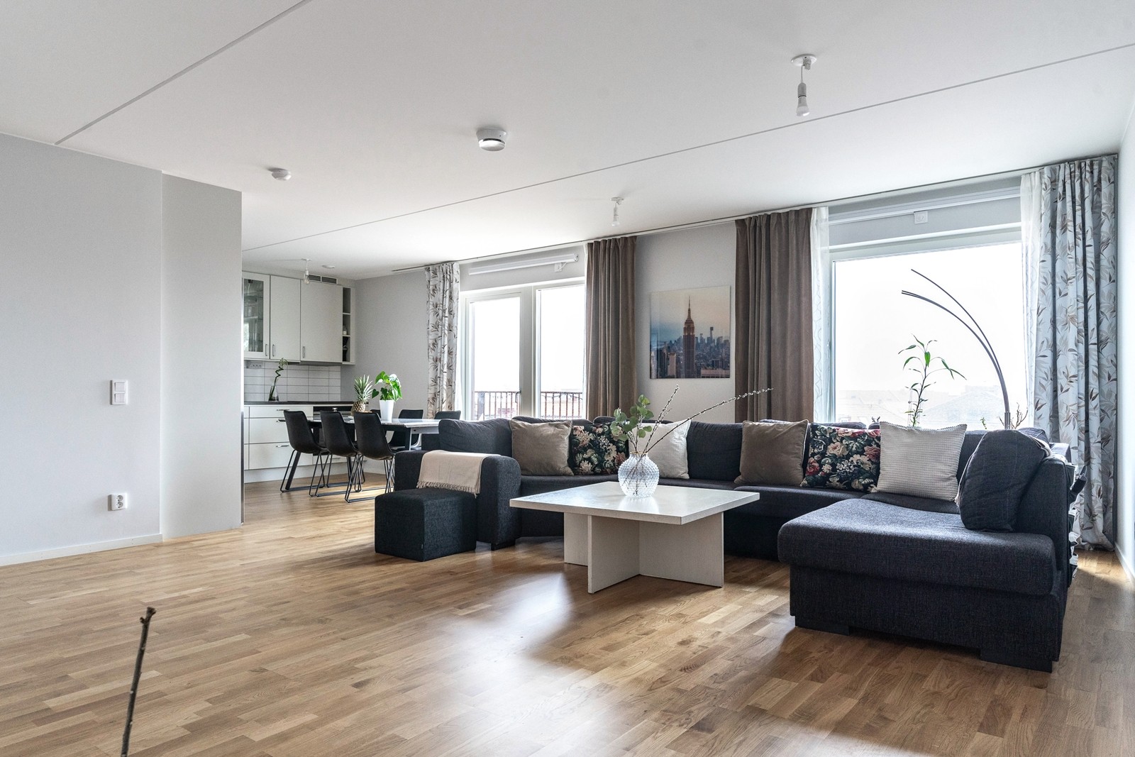 I slutet av hallen öppnar bostaden upp sig och nu befinner du dig i vardagsrummet och kök som har en öppen planlösning. Lägenhetens vardagsrum har fint ljusinsläpp och utgång till lägenhetens rymliga balkong. Vardagsrummet har gott om yta för stora möblemang så som stor soffgrupp med tillhörande möblemang samt matsalsbord. Vardagsrummet har en öppen planlösning mot köket.