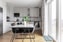 Det stilrena köket med flera tillval utöver standard med köksinredning i vitt från Vedum, arbetsytor i mörk laminat och vitt kakel i rak liggande sättning. Ovan arbetsytorna sitter en ljusramp med spotlights. Köket är utrustat med induktionshäll, fläkt, inbyggd ugn, micro, integrerad diskmaskin samt kyl och frys i fullhöjd. Samtliga vitvaror är från Siemens och rostfritt.