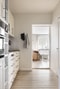 Direkt i hallen möts du av det praktiska köket med vita luckor och vitt kakel ovan bänkskiva i trä. Utrustningen består av diskmaskin (2023), spishäll, fläkt, kombinerad ugn och mikro (2023) i arbetshöjd samt kombinerad kyl och frys.
