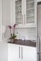 Köket är i stilrent utförande med spegelluckor i vitt som bryts av mot en grå laminatbänkskiva och vitt kakel ovan arbetsytorna. Köket är praktiskt utformat i vinkel med mycket förvaring och stora arbetsytor. Maskinell utrustning består av ugn med häll, fläkt, diskmaskin samt kombinerad kyl och frys. Här finns även gott om utrymme för en matplats invid fönstret.