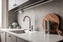 Det moderna köket med grå luckor erbjuder gott om förvaringsmöjligheter. Ovan arbetsytorna sitter stilsäkert kakel som stänkskydd. Den maskinella utrustningen består av induktionshäll, fläkt, ugn, mikro, integrerad diskmaskin samt kombinerad kyl och frys. Här finns också utrymme för ett köksbord.