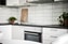 Köket är ljust inrett med vita skåpsluckor och ovan arbetsbänken i mörk laminat sitter vitt kakel som väver samman helhetskänslan. Arbetsbänken lyses upp av spottar under överskåpen. Den moderna köksutrustningen består av spishäll, ugn, fläkt, inbyggd micro och kombinerad kyl/frys. Matplatsen har sin givna plats intill fönstret med utsikt mot innergården.