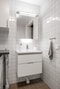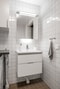 Badrummet är stilrent och erbjuder allt du kan tänkas behöva. Tvättställ med kommod och ovanhängande spegelskåp med belysning, wc-stol och duschhörna med vikbara duschväggar samt handdukstork. Kombinerad tvättmaskin och torktumlare underlättar vardagen. Ovanför maskinerna sitter en bänkskiva att vika tvätten på. Väggar är kaklade i vitt och grått klinker ligger på golvet.