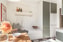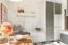 Kök i naturlig storlek med utsikt in mot föreningens trivsamma innergård. Skåpluckor i en behaglig grön nyans, vitt kakel ovan bänkskiva i rostfritt och ljus laminat. Här finns matplats för fyra och god förvaring av allehanda grytor och porslin. Den maskinella utrustningen består av spis, ugn, fläkt samt kyl och frys.