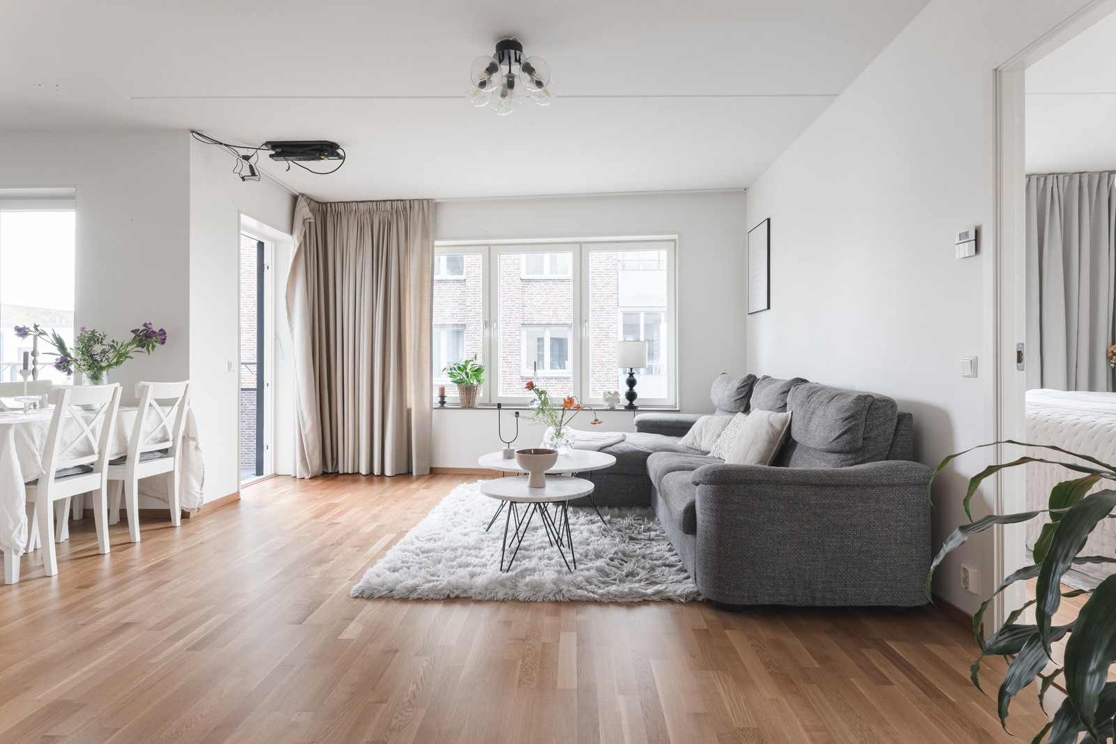 Du kommer in en öppen planlösningen mellan vardagsrum och kök. Stora fönsterpartier släpper in generöst med ljus. Möblera efter eget tycke och smak då en stor soffgrupp med tillhörande möblemang samt även plats för matsalsbord för större sällskap, enkelt får plats här. Planlösningen är gjord för att umgås i och här bjuder du in dina nära och kära till många trevliga stunder. Från vardagsrummet når du balkongen som vetter in mot gården i ett högt läge i huset.