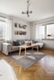 Vardagsrummet erbjuder öppna sociala ytor där många gäster ryms. På golvet ligger vacker bevarad fiskbensparkett och väggarna är målade i vitt. Fönsterpartiet släpper in ljuset som får sprida sig fint i rummet. Här ryms med enkelhet större soffgrupp med tillhörande möblemang och matsalsbord.