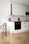 Öppna planlösningen mellan kök och vardagsrum, här ryms både ett mindre matbord, soffa samt säng med en given plats i hörnet. Härifrån nås den rymliga och möblerbara balkongen i soligt söderläge.