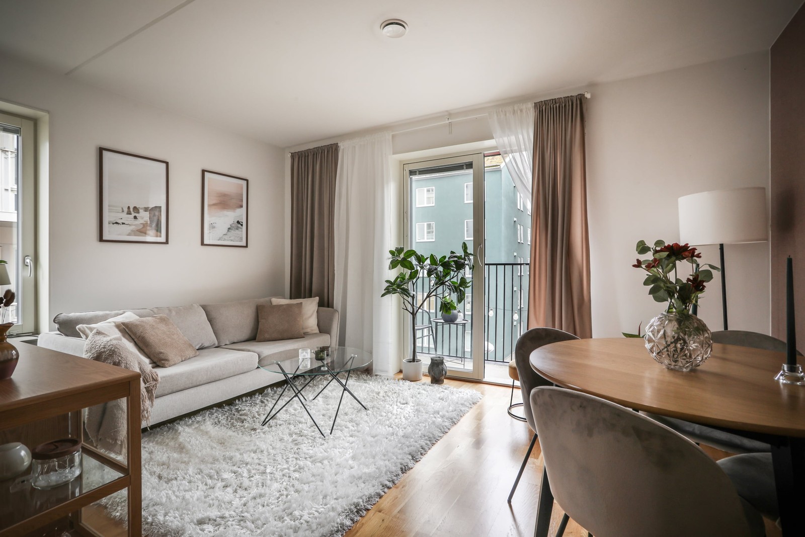 Det ligger med en öppen planlösning mot köket vilket skapar en härlig rymd tillsammans med fönster från balkongen som vetter mot ett soligt söderläge.