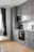 Köket är praktiskt utformat med vita skåpssnickerier som har goda förvaringsmöjligheter. Maskinparken omfattas av en kombinerad kyl och frys, ugn, spishäll, inbyggd mikrovågsugn, inbyggd spisfläkt samt integrerad diskmaskin. Väggen ovanför den ljusa bänkskivan bekläds av vitt liggande kakel. Ovan bänken ger spotlights ett behagligt ljus. I anslutning till köket finns det plats för matgrupp för fyra personer.