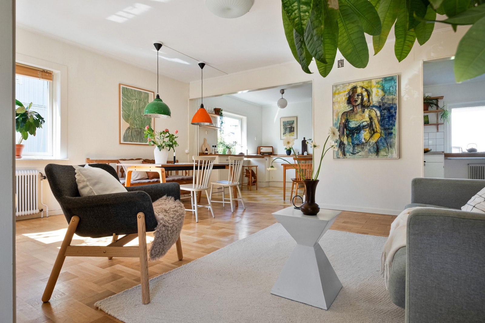 Redan vid entrén möts du av den genuina karaktären som genomsyrar hela hemmet. De vackra plankgolven och klassiska parkettgolven ger en varm och välkomnande känsla. Huset bjuder på stora, ljusa sällskapsrum där takhöjden och de generösa fönsterpartierna skapar en härlig rymd.