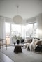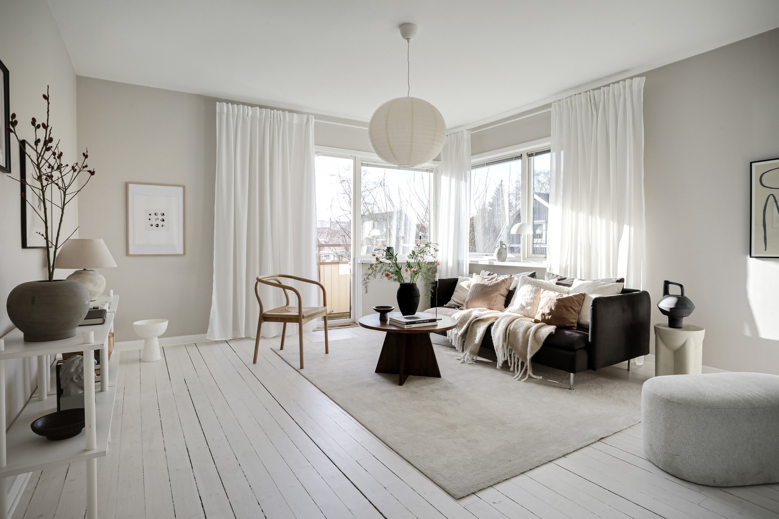 Vardagsrummet är rymligt till ytan och ger plats för större soffgrupp med tillhörande möblemang. Fönster tillsammans med balkongdörren i gavelläge släpper in ett härligt ljus som sprider sig fint i rummet. Väggarna är målade i harmonisk varm ton. Tillsammans med färgsättningen och takhöjden skapas här en härlig rymd och känsla. Från vardagsrummet nås även den fantastiska balkongen som vetter mot ett soligt söderläge. Här får ni en härlig vy över villaområdet, samt där ni blickar ut över föreningens grönskande gård.