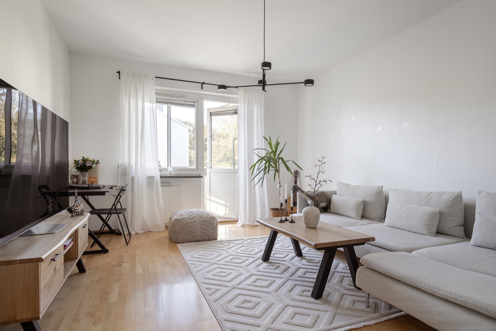Vardagsrummet är generöst i storlek och bjuder på ytor som är lätta möblera efter personligt tycke och smak. Här finns gott om plats för soffgrupp med tillhörande möblemang och middagsbord eller kontorshörna om så önskas. Som en förläning av rummet når du bostadens balkong som ligger i västerläge med eftermiddags- och kvällssol. Distansen till grannhusen ger en insynsfrikänsla och tillåter solen att stråla fritt.