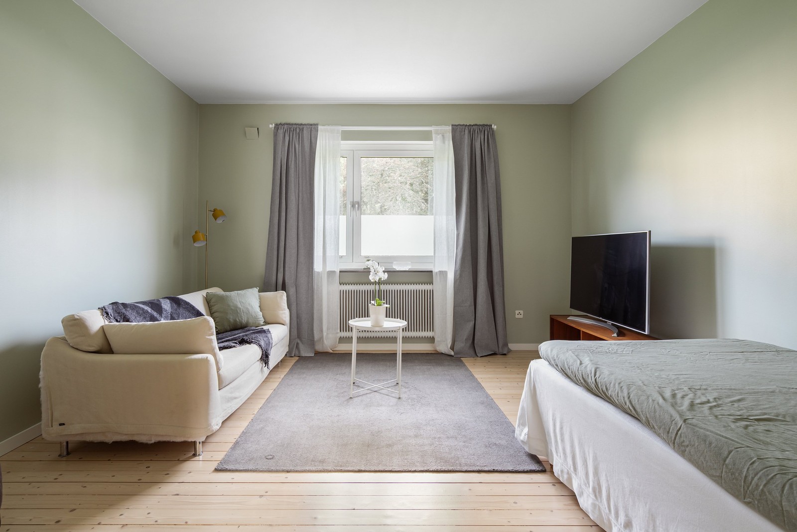 Vardagsrummet är generöst i storlek och rymmer både soffgrupp samt en större säng. Härligt ljusinsläpp samt vy mot den gröna innergården.